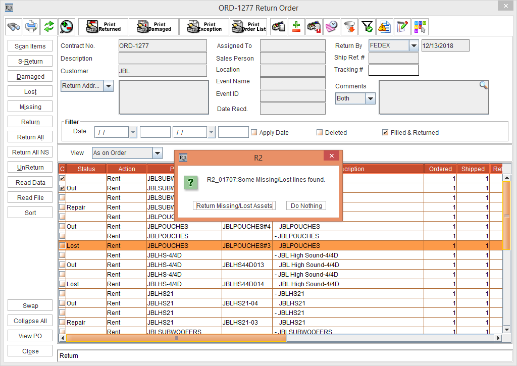 5. Click the Return button. The system displays a prompt with the message "R2_01707: Some Missing/Lost lines found." with Return Missing/Lost Assets button and Do Nothing button, as shown in Figure 2.10.