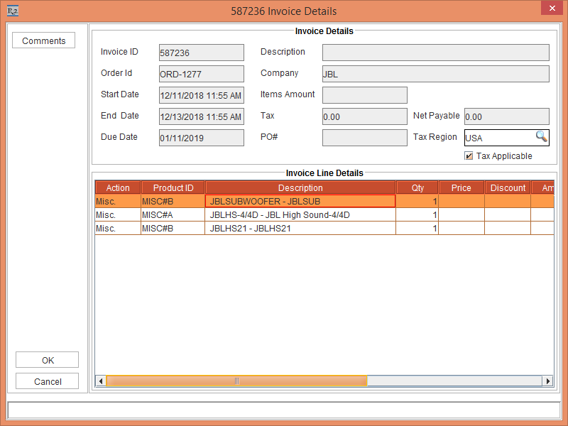 2. The system will not update the initially generated Invoice [586844]  and generates a new Open Lost and Repair Invoice for the Serial Item [JBLSUBWOOFERS] with Lost Status as 586958 Invoices Details window is generated and is displayed, as shown in Figure 2.9.