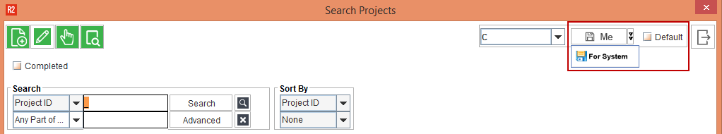 Support has been added in the Project Search window for the user(s) to create and save their search criteria (and results) with values/Sort By/Filters (Completed check box) for quick action.