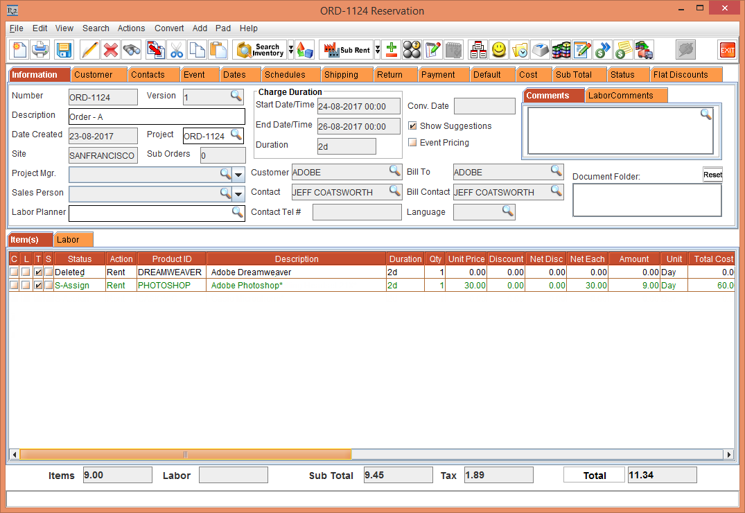 Figure 1.6 Items [DREAMWEAVER] and [PHOTOSHOP] copied to the Rental Reservation Order [ORDER-1125]