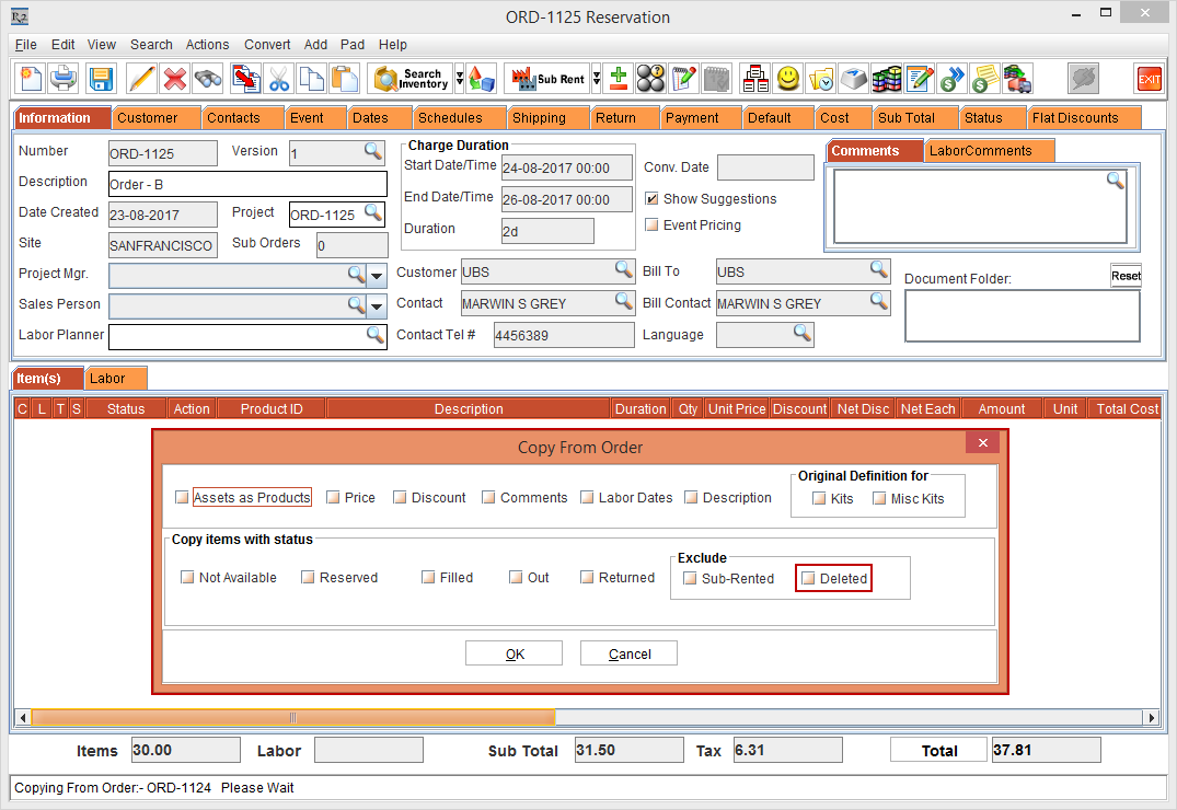 1. Double-click the Rental Reservation Order [ORDER-1124], the Copy From Order window is displayed. A new option Deleted check box is included in the Exclude section of the Copy From Order window, as shown in Figure 1.5.