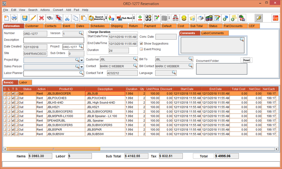 Tag a Company [JBL] > create a Rental Reservation Order [ORD-1277] for 2 days duration.