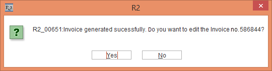 Click the Generate Invoices button. The system displays a prompt with the message "R2_00651: Invoice generated successfully. Do you want to edit the Invoice no. 586958?," as shown in Figure 2.8.