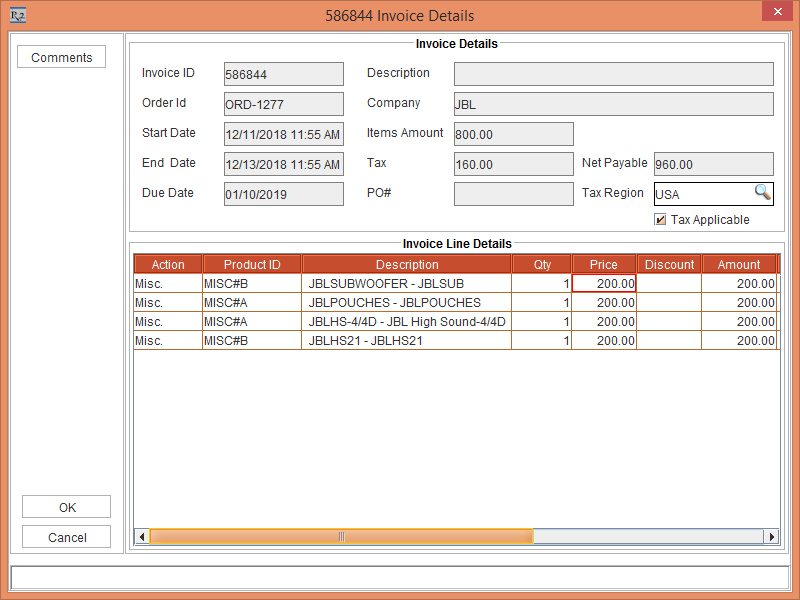 The system will not update the initially generated Invoice [586844] and generates a new Open Lost and Repair Invoice for the Serial Item [JBLSUBWOOFERS] with Lost Status as 586958 Invoices Details window is generated and is displayed, as shown in Figure 2.9.