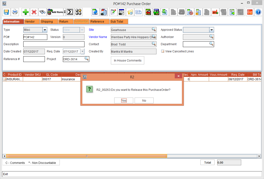 Exit the Purchase Order > the system display the message "Do you want to Release this Purchase Order?" , as shown in Figure 1.4.