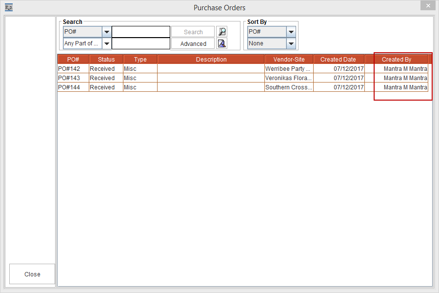 Support for additional column as Created By in the Purchase Orders window when multiple Purchase Order exists for a Misc line.