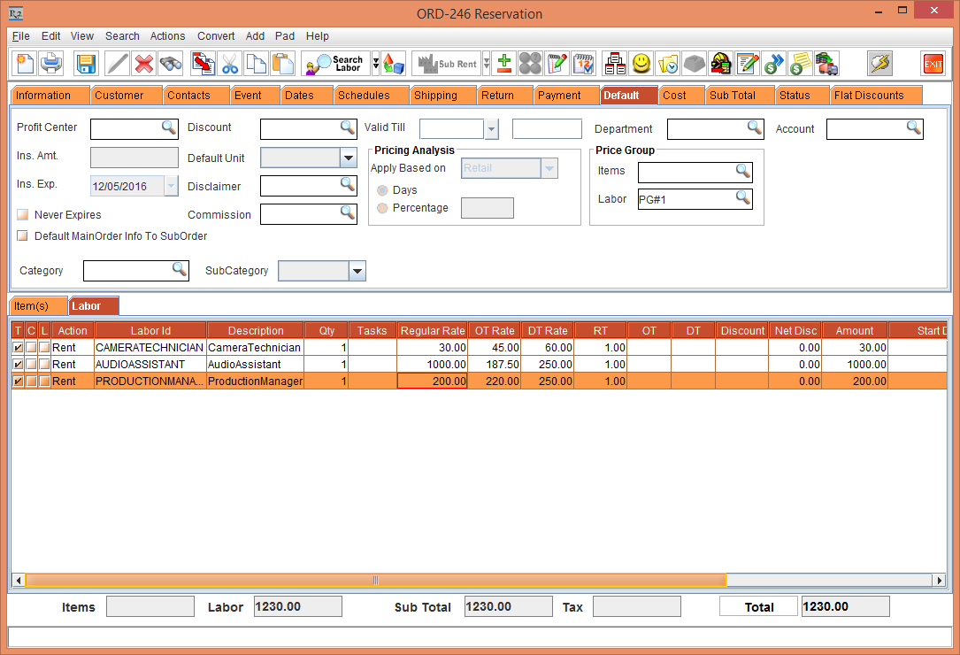 Figure14.0 Labor Price Group [PG#1] tagged to the Rental Reservation Order [ORD-246] from the Default tab