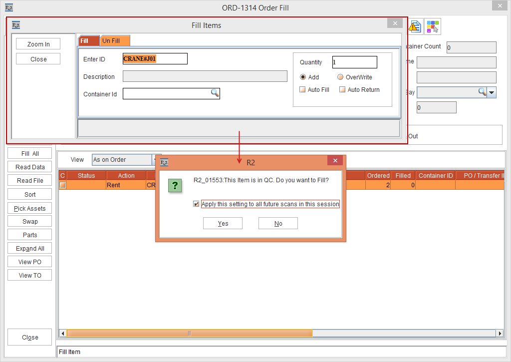 On the Date [15-April- 2019] open the Prep Task of [ORD-1314] and scan the Asset [CRANE#J01] that is in QC Status to fill it. The system displays the message, “R2_10533:This Item is in QC. Do you want to Fill?” with "Apply this setting to all future scans in this session" check box, as shown in the Figure 1.3.
