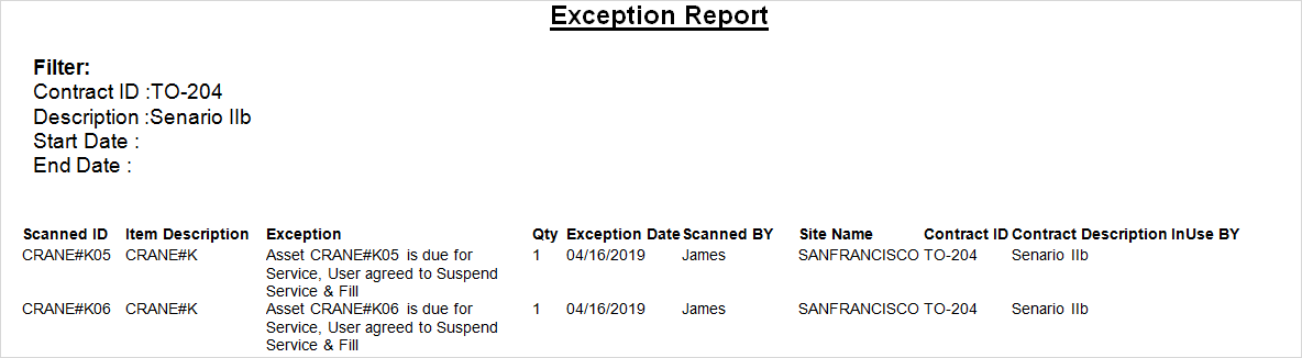 Click Suspend Service. The Asset [CRANE#Q01] is modified to Return Status.