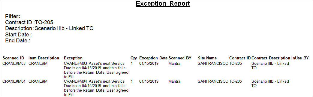 Click the Suspend & Return button. The Status of the Assets [CRANE#N01] and [CRANE#N02] is modified to Returned.