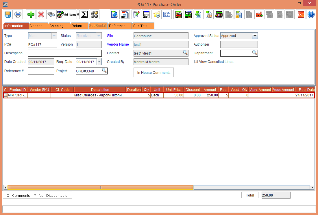 From the Rental Reservation Order [ORD-3340], right-click the Item and select the option Open PO. The Misc Purchase Order is displayed, as shown in the Figure 1.4.