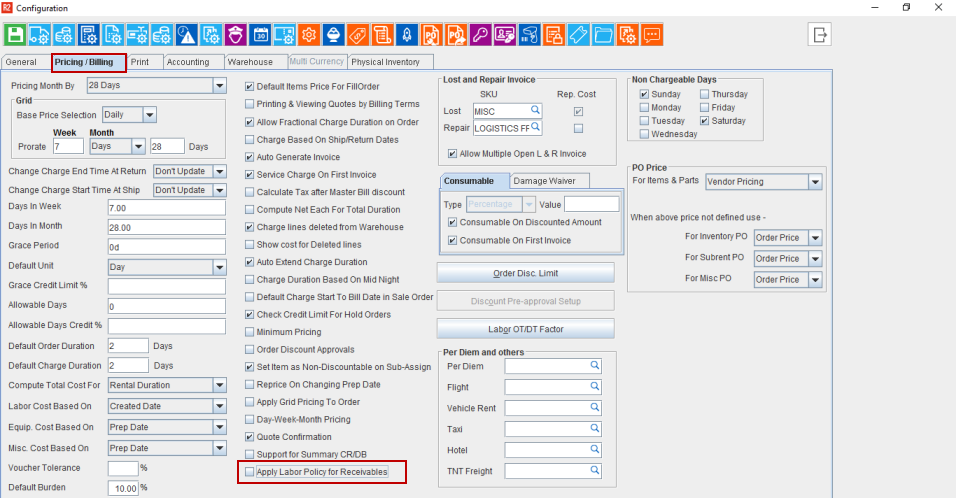 Figure 1.0: 'Apply Labor Policy for Receivables' checkbox in Configuration module