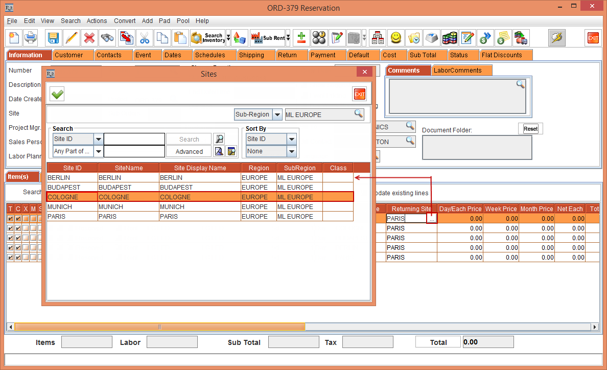 The Shipping Site and the Returning Site is displayed as [ML EUROPE] which is the Sub-Region ID, due to the Cutoff time in days [3] in the Sub-Region window.