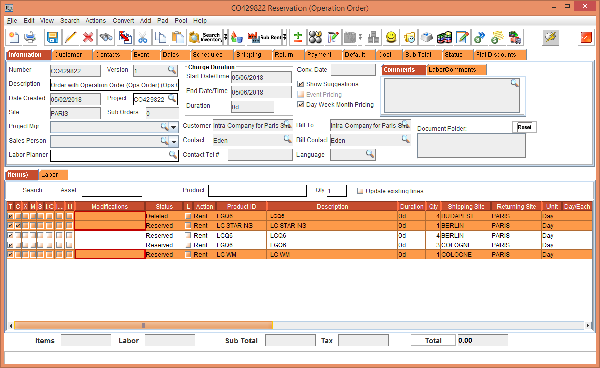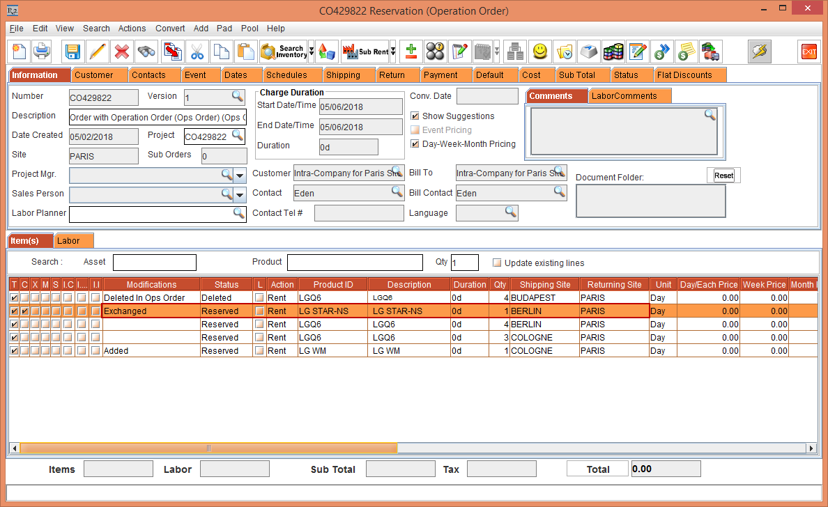 The Item line [LG LED] gets split into four lines in which three of the Item lines Status is displayed as [Reserved] with the Shipping Site displayed as Sites [BERLIN], [BUDAPEST], and [PARIS] respectively. The Returning Site for all the three Item lines is displayed as the Order Site [PARIS], as shown in Figure 4.8.