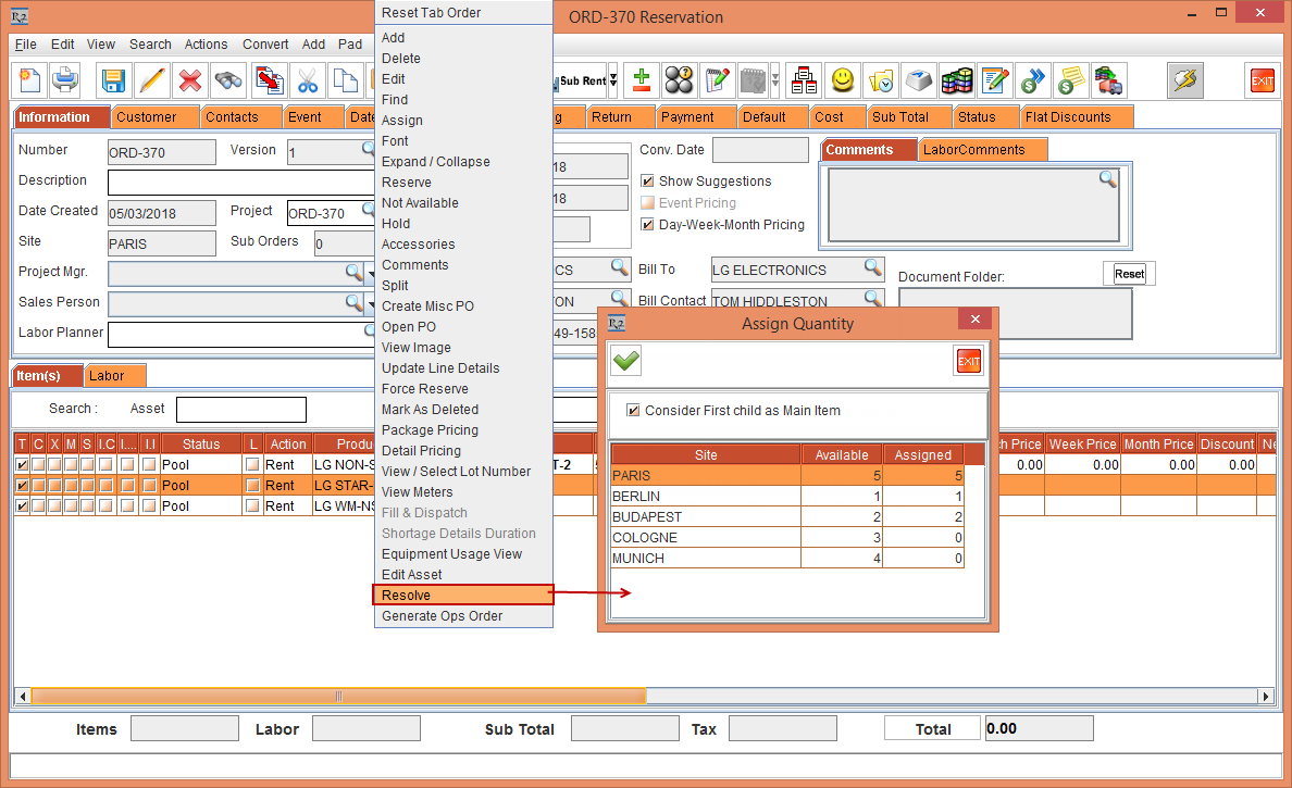 In the Rental Reservation Order [ORD-379], select the Item line [LG LED] with 30 Qty and select the Pool menu > Resolve option.