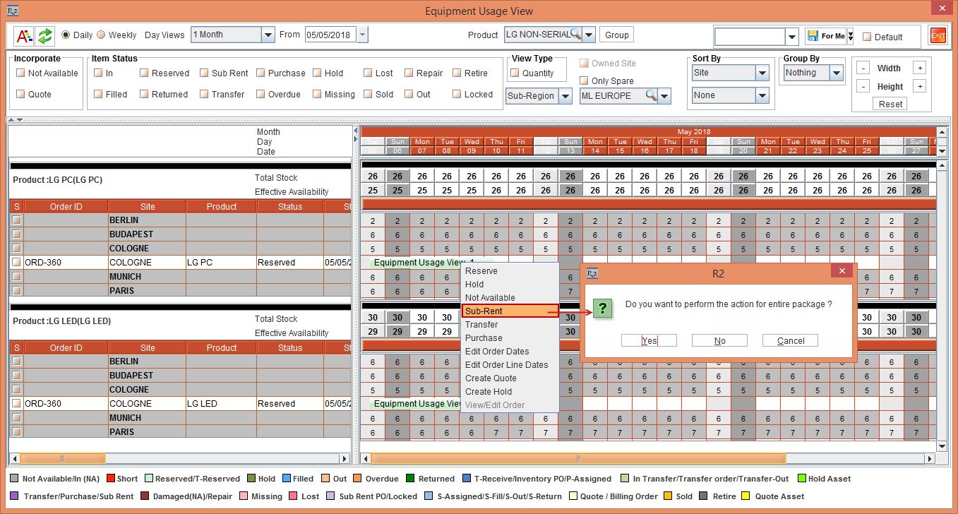 The modification of Status from the Equipment Usage View window is implemented for Reserve, Hold, Not Available, Sub-Rent, Transfer, and Purchase reflecting the changes in the Order.