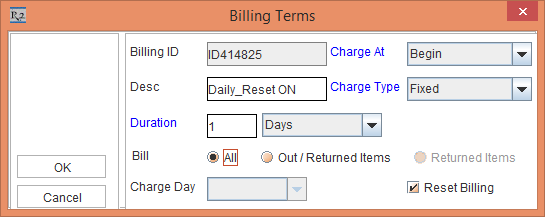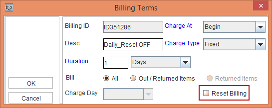 The Reset Billing check box in Billing Terms dialog is available for both Day-Week-Month Pricing selected and when Day-Week-Month Pricing is not selected in Orders.