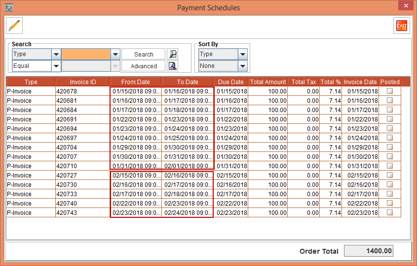 Select the View menu > Payment Schedules option. The Payment Schedules window is displayed. There will be 40 separate Invoices generated for 40 days separately as the Billing is Daily and Reset Billing check box is selected. This is, as shown in the Figure 2.3.