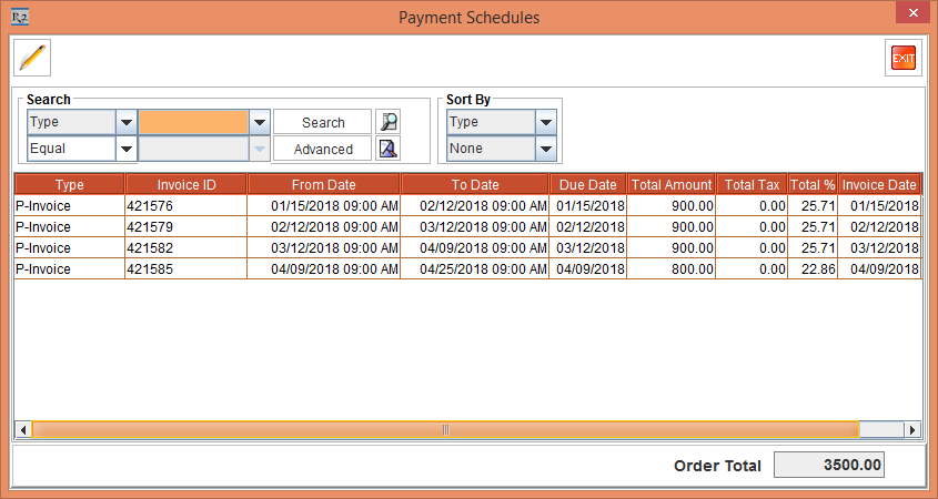 Select the View menu > Payment Schedules option. The Payment Schedules window is displayed. Observe the Invoices generated in Figure 4.32. There are 4 separate Invoices generated.