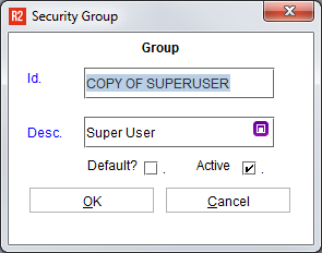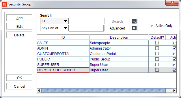 Existing Security Groups can be copied to a new Security Group name. Begin at the Security Group screen then right-click on the Security Group you want to duplicate: