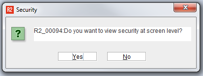 2 | Start Security Mode by pressing the F6 key on your keyboard. R2 will ask if you wish to view security at the screen level. ![]() Upon selecting Yes, the security changes will be applied to the entire screen. Upon selecting No, the security mode will be set to component level, and security can be applied to individual screen components. |