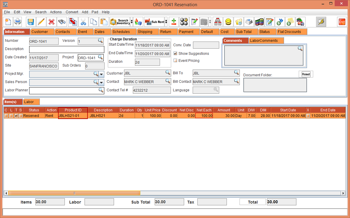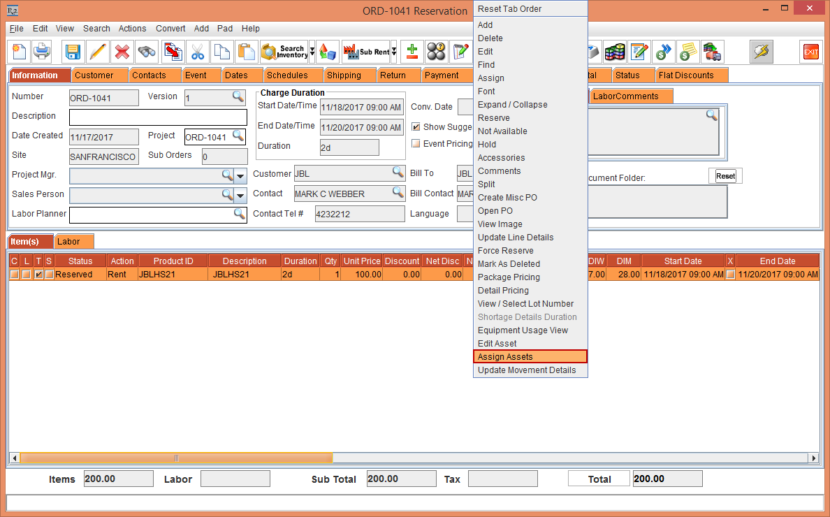 The Asset [JBLHS21-01] line is included in the Rental Reservation Order [ORD-1041], as shown in Figure 1.2.
