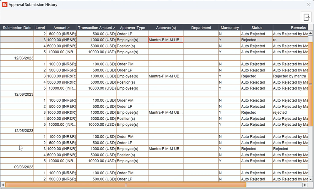 Mandatory (Y/N) | Whether the approval at current level was mandatory or not. |